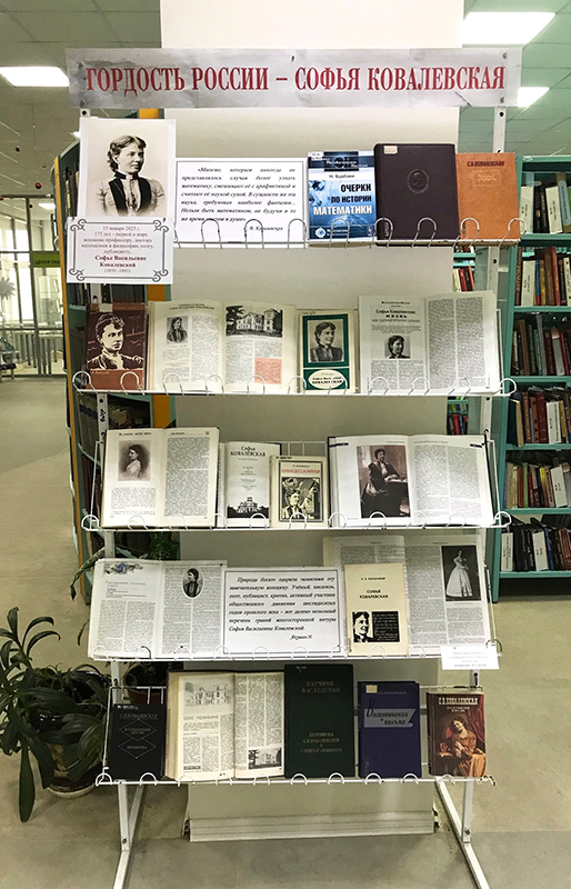 В универсальном читальном зале на выставке «Гордость России – Софья Ковалевская» (к 175-летию со дня рождения С.В. Ковалевской) представлена литература о жизни и творчестве Софьи Васильевны, журнальные статьи.