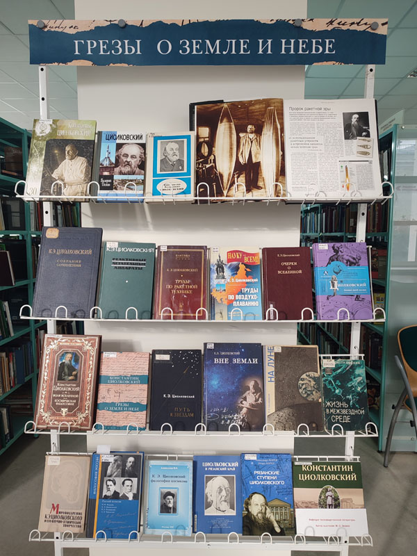 На выставке представлены труды. К.Э. Циолковского и издания о его жизни, деятельности и творчестве.