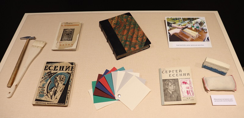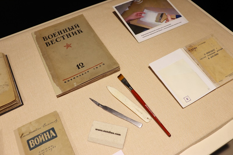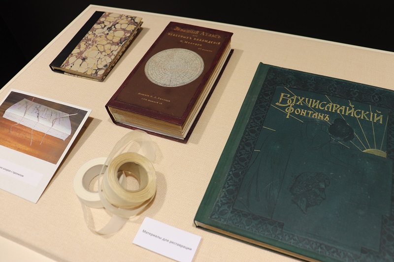 Экспозиция дополнена инструментами и материалами, которые используют в работе реставраторы библиотеки, а также фотографиями процесса реставрационных работ.