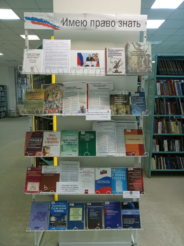 В универсальном читальном зале библиотеки работает книжная выставка, посвященная Дню прав человека. Материалы книжной выставки помогут читателям в изучении своих прав и обязанностей, познакомят с законодательными актами Российской Федерации.