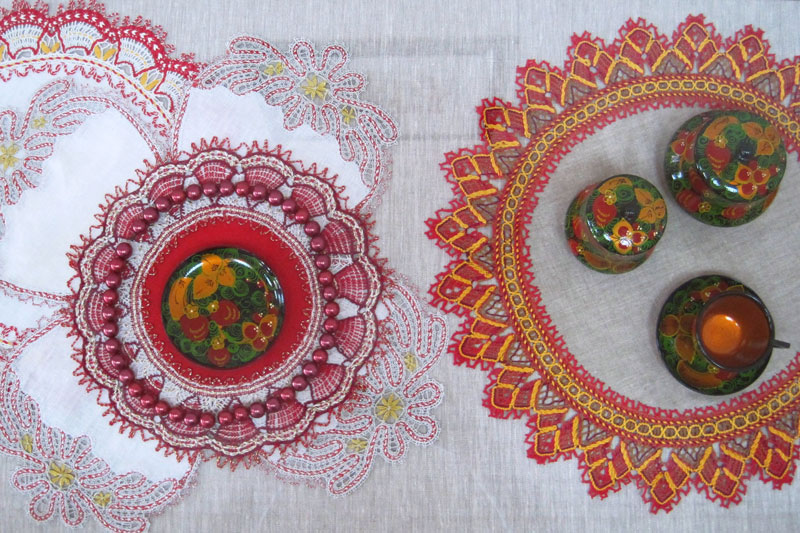 На выставке представлена только малая часть изделий Татьяны Михайловны. Поражает тонкая работа и разнообразие узоров, украшающих скатерти и салфетки. Все они выполнены в технике традиционного Михайловского кружева. Увидев экспозицию, кто-то заинтересуется историей рязанских народных промыслов, кто-то захочет оформить интерьер в этнографическом стиле, а у кого-то возникнет желание научиться плести на коклюшках и создавать свои неповторимые узоры.
