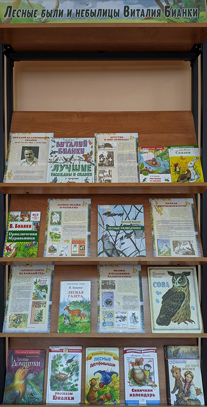 К 130-летнему юбилею В. В. Бианки на кафедре детской литературы оформлена выставка, где представлены книги писателя, где главными героями являются животные с их повадками, ловкостью, хитростью, умением спасаться и прятаться.