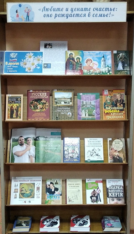 На выставке, работающей на кафедре абонемента, представлена литература из фонда библиотеки, рассказывающая о русских традициях и обрядах, о роли семьи в современном обществе, о принципах построения семейного счастья. Знакомясь с литературой, можно узнать и о проблемах воспитания детей, здоровом образе жизни, активном семейном отдыхе.