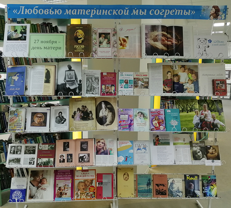 К Дню матери в универсальном читальном зале оформлена книжная выставка, на которой представлены художественные произведения, научно-популярная литература, а также статьи из периодических изданий о материнстве.