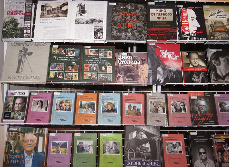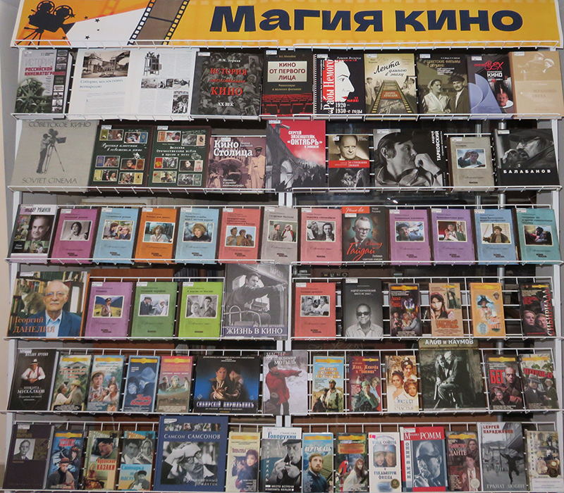 На выставке представлены книги по истории российского кинематографа, о творчестве великих актеров и режиссеров и видеокассеты с нашими любимыми фильмами.