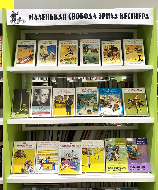 На выставке представлены произведения Эриха Кестнера на немецком языке как в оригинале, так и в адаптированном варианте.