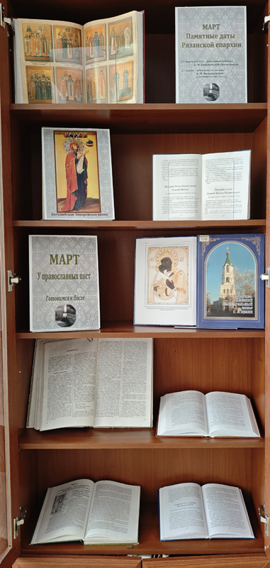 Краеведческий информационный отделНа выставке представлен материал об иконах, которые почитают в Рязанской епархии в марте, слова митрополита Симона по неделям Великого поста, а также книги о традициях проведения поста на рязанской земле в дореволюционное время.