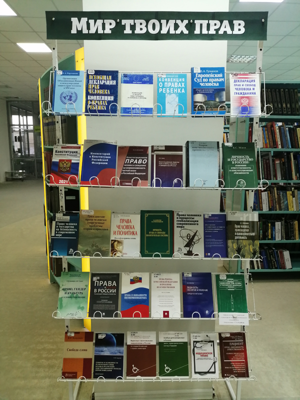 В универсальном читальном зале работает выставка «Мир твоих прав». На выставке представлена литература, которая познакомит посетителей с законодательными актами Российской Федерации, поможет в изучении прав и обязанностей.