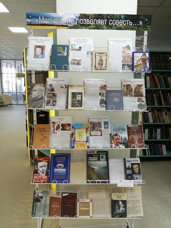 На книжной выставке «Молчать не позволяет совесть…» представлены повести Валентина Распутина, давно ставшие классикой: «Живи и помни», «Прощание с Матерой», «Последний срок», «Пожар», рассказы и очерки, литература о жизни и творчестве писателя.