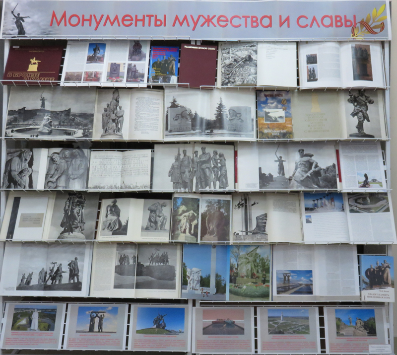 На выставке представлены книги, альбомы с фотографиями памятников, мемориалов, скульптурных монументов.