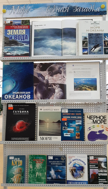 На выставке представлена литература о морях нашей планеты, о морских обитателях и секретах подводного мира. Многие книги акцентируют внимание читателей на экологических проблемах, на вопросах рационального использования и охраны морских объектов.