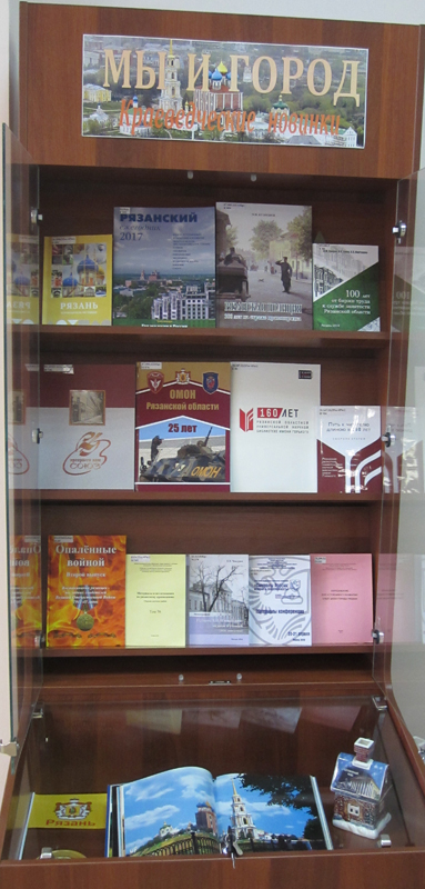 На ней представлены издания 2018 года, посвященные 300-летию рязанской полиции, 160-летию Рязанской областной универсальной научной библиотеки имени Горького, 100-летию Рязанского художественного училища имени Г.К. Вагнера и службы занятости Рязанской области, материалы по рязанскому краеведению и другие.