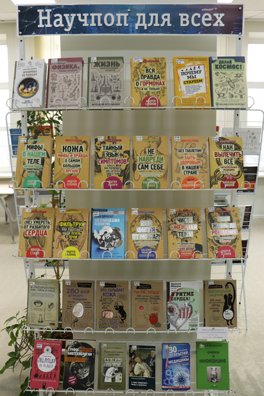 Книжная выставка «Научпоп для всех» организована в рамках проекта «Год науки и технологий в библиотеке им. Горького».