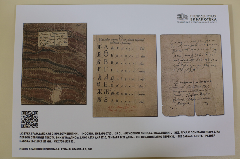 На выставке представлена электронная копия издания из электронного фонда Президентской библиотеки «Азбука гражданская с нравоучениями» с пометами Петра I, изданная в 1710 году. На копии указан QR-код, позволяющий посмотреть книгу полностью на портале Президентской библиотеки.