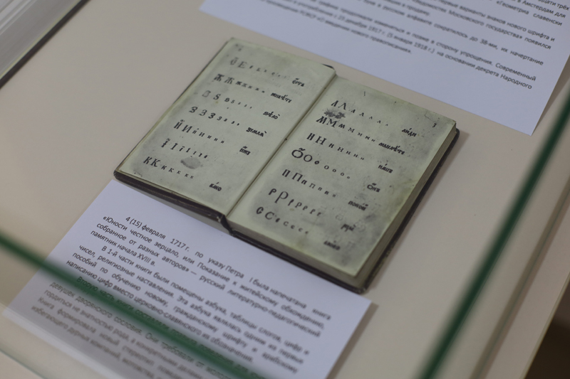 На выставке представлено факсимильное воспроизведение книги «Юности честное зерцало, или Показание к житейскому обхождению…», напечатанное 4(15) февраля по указу Петра I. Это русский литературно-педагогический памятник начала XVIII в. В 1-й части книги были помещены азбука, таблицы слогов, цифр и чисел, религиозные наставления. Эта азбука являлась одним из первых пособий по обучению новому, гражданскому шрифту и арабскому написанию цифр вместо церковно-славянского их обозначения. Вторую часть книги составляли правила поведения для юношей и девушек дворянского сословия.