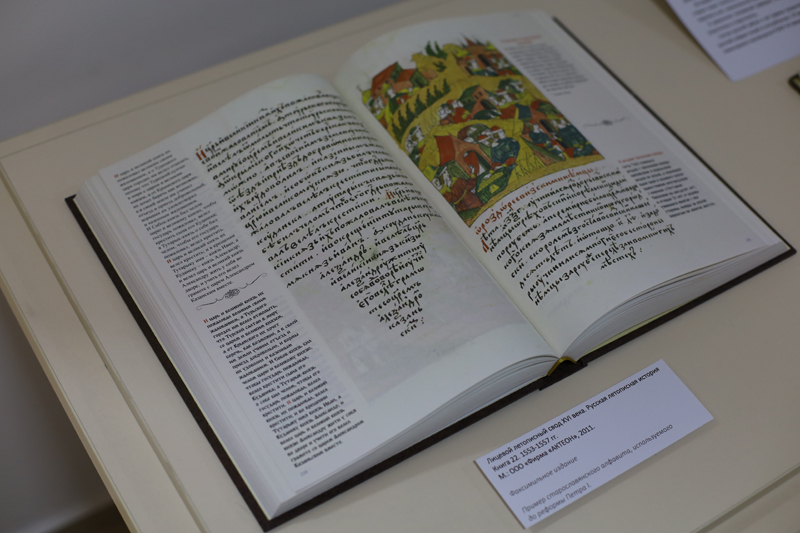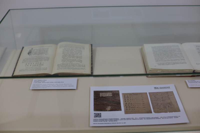 Кроме того, можно ознакомиться с книгами В.А. Истрина «Возникновение и развитие письма» и В.А. Правдолюбова «История письма» и др., рассказывающими об истории письменности. Также в экспозиции представлено факсимильное издание «Лицевой летописный свод XVI века. Русская летописная история Книга 22. 1553-1557 гг.», в которой можно увидеть пример старославянского алфавита, используемого до реформы Петра I.