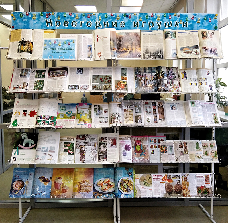 В книгах и журналах, представленных на выставке в зале периодических изданий, посетители библиотеки найдут информацию о появлении праздника и новогодних игрушек, о традициях празднования Нового года в России и зарубежных странах. На выставке также размещены публикации с рекомендациями о том, как сделать новогодние игрушки из бумаги, бисера, ткани, природных материалов.