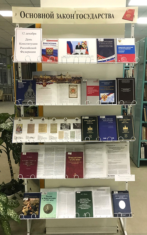 На книжной выставке представлены тексты Конституций разных периодов истории российского государства, книги и статьи об истории создания Конституций советского государства, новая литература по данной теме.