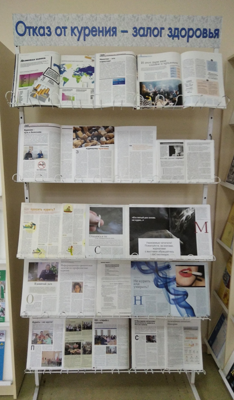 В зале периодических изданий работает тематическая выставка, приуроченная к Международному дню отказа от курения. В 2020 году этот день приходится на 19 ноября.