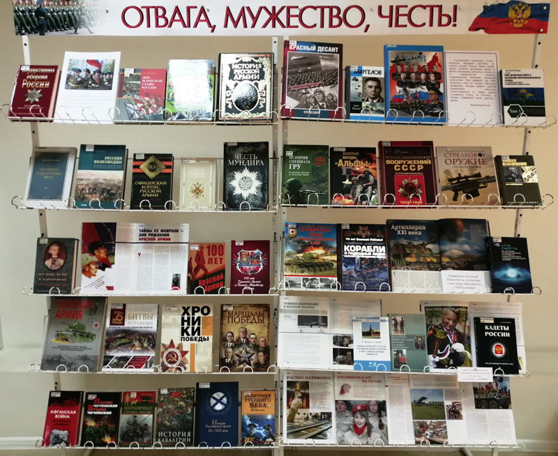 В универсальном читальном зале работает выставка, которая знакомит читателей с историей нашей армии, с самыми знаменитыми сражениями, с выдающимися русскими полководцами и военачальниками; посетители узнают много интересного об оружии и боевой технике.