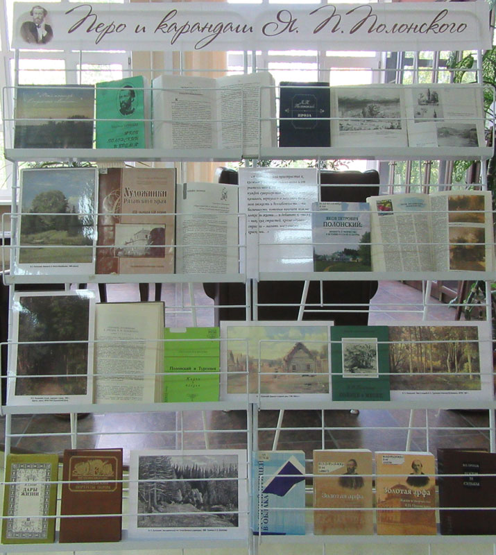 Немало блестящих имен литераторов мы встречаем в списке художников. Одно из них – имя Якова Петровича Полонского, для которого живопись стала страстью и радостью всей жизни. На выставке представлены монографии, переписка поэта с деятелями литературы, журнальные публикации, дополняющие наше представление о Полонском-художнике, проиллюстрированные рисунками и этюдами поэта, выполненными в разное время. Среди авторов, открывающих для нас Полонского-художника, – Н.Н. Фонякова, Л.А. Пронина, С.Д. Анфимов, В.М. Касаткин, А.Н. Потапов. Статья о Полонском включена и в биобиблиографический словарь «Художники Рязанского края XIX – начала XX веков» (Рязань, 2010).