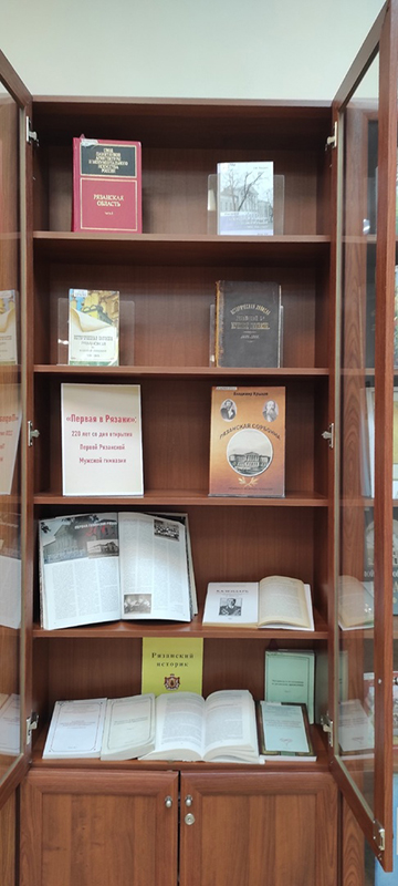 В экспозиции представлена уникальная книга «Историческая записка Рязанской I-й мужской гимназии.1804–1904» (Рязань, 1904), а также репринтное издание 1995 года.