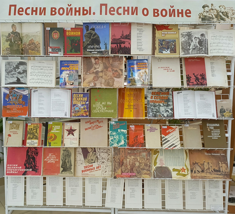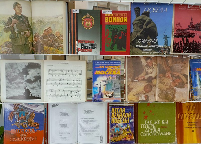 На выставке представлены книги, нотные сборники, грампластинки с песнями о Великой Отечественной войне.