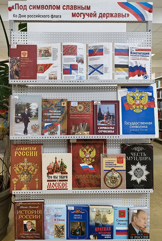 К дню государственного флага Российской Федерации в центре книги и чтения оформлена выставка, посвященная государственным символам России. Из книг, представленных на выставке, читатели узнают о появлении, оформлении и значении флага, о версиях обозначения цветов Российского стяга, о том, в каких случаях поднимается флаг Российской Федерации.