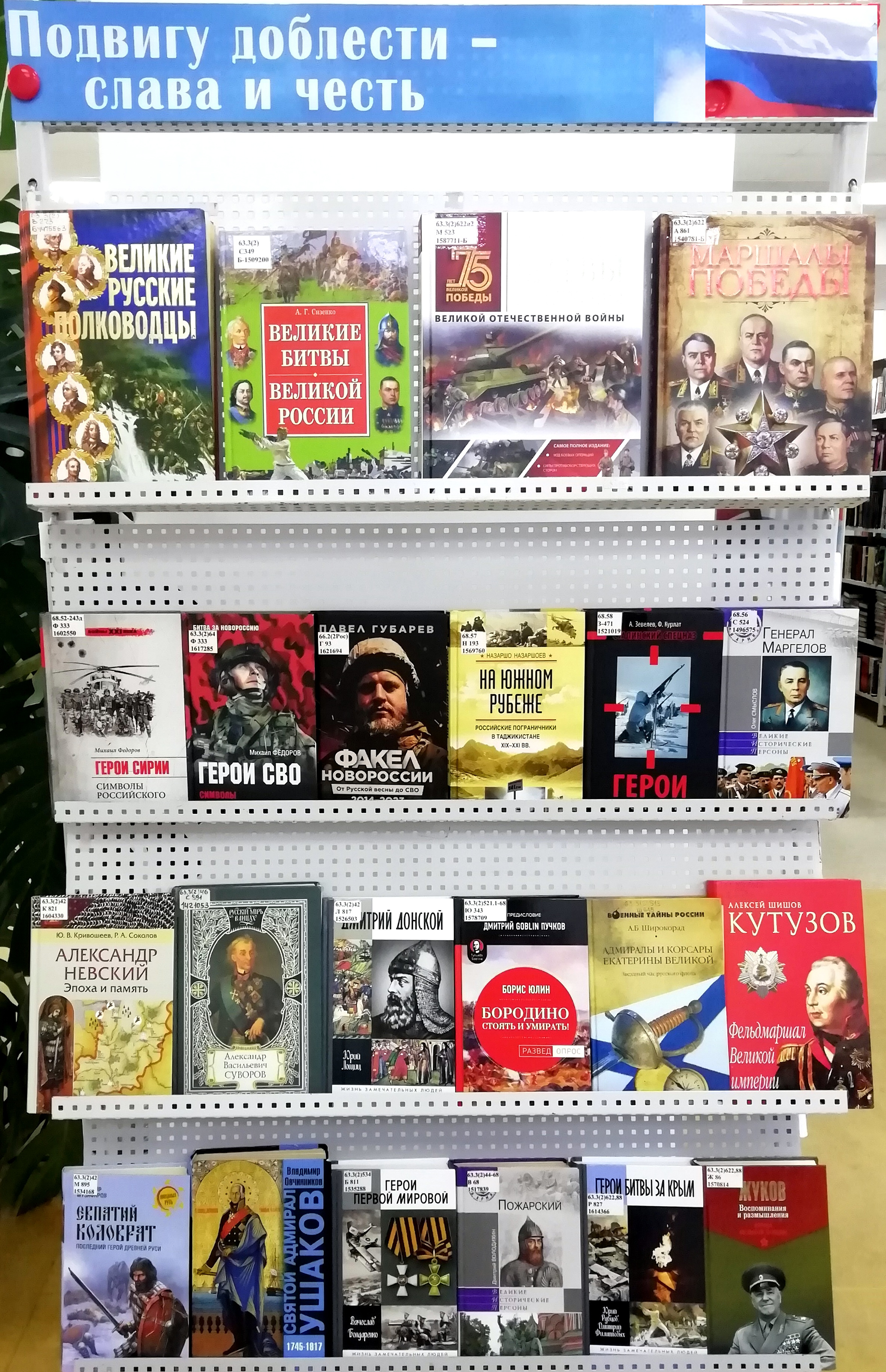 На выставке представлены издания, рассказывающие о военной истории России: от Александра Невского и Дмитрия Донского до Кузьмы Минина и Дмитрия Пожарского, от Александра Суворова и Петра Багратиона до Георгия Жукова и Василия Маргелова.