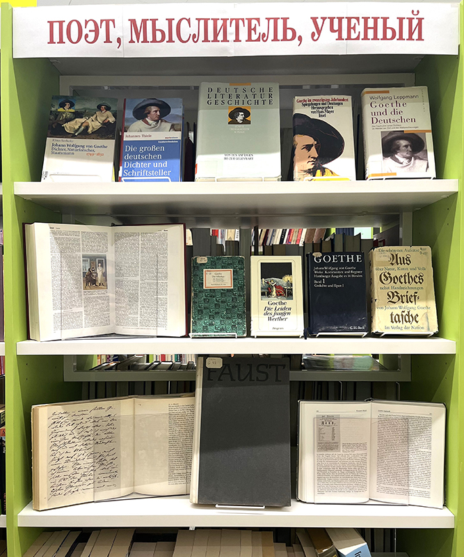 На книжной выставке в центре межкультурных информационных ресурсов на иностранных языках представлены работы литературоведов, посвященные жизни и творчеству Гете, а также издания его произведений на языке оригинала.