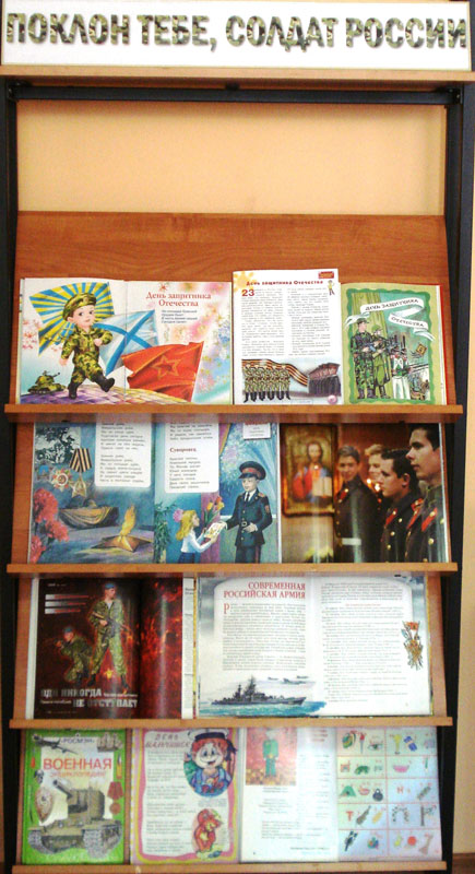 Праздник 23 февраля – это дань нашего уважения всем поколениям российских воинов, мужественно защищавших родную землю. На выставке представлены сборники стихов и рассказов, повествующие о знаменитых битвах на суше и на море, об отважных героях, которые свою жизнь отдали служению Родине и стоят на страже ее рубежей и сегодня.