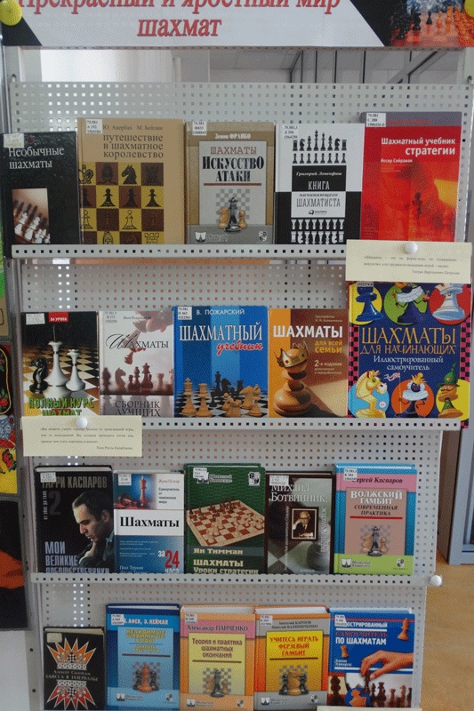 С 1 по 15 июля в Центре книги и чтения работает выставка «Прекрасный и яростный мир шахмат». На ней представлена литература для начинающих и опытных шахматистов – учебные пособия, сборники с разбором партий, книги, рассказывающие о жизни известных игроков.