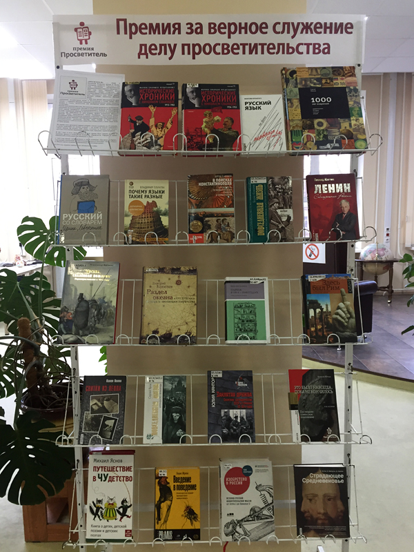 В ноябре в зале периодических изданий работает выставка «Премия за верное служение делу просветительства». Выставка приурочена к ежегодному событию – объявлению победителей премии. Премия была учреждена в 2008 году российским предпринимателем Дмитрием Зиминым и фондом «Династия», она присуждается за произведения, написанные на русском языке и ставящие своей задачей просвещение «неспециализированного читателя» в гуманитарной, научной, технической областях. Цель – «привлечь внимание читателей к просветительскому жанру, поощрить авторов и создать предпосылки для расширения рынка просветительской литературы».