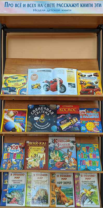 В рамках Недели детской книги на кафедре детской литературы работает выставка «Про всё и всех на свете расскажут книги эти». В экспозиции представлены интересные и познавательные издания для детей. Книги дадут исчерпывающие ответы на множество вопросов из области техники, истории, географии, расскажут о природных явлениях.