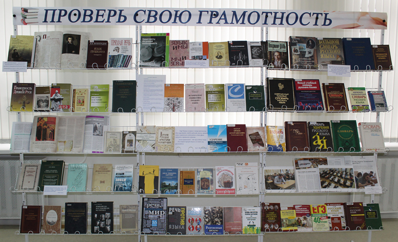 В универсальном читальном зале работает книжная выставка «Проверь свою грамотность». На ней представлена литература об истории русского языка, учебные пособия, словари, а также книги по культуре речи и грамматике.