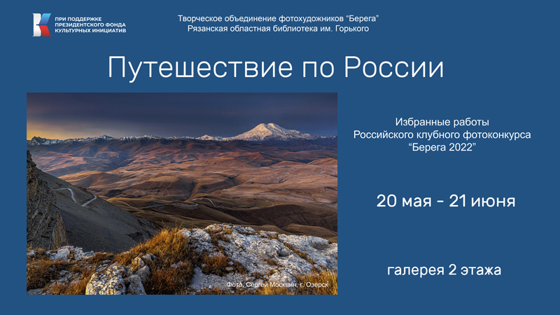 20 мая в 12:00 в галерее 2-го этажа состоится открытие итоговой выставки четвертого сезона Российского клубного фотоконкурса «Берега-2022», проводимого при финансовой поддержке Президентского фонда культурных инициатив. В экспозиции будут показаны лучшие работы конкурса по секции «Путешествие по России».