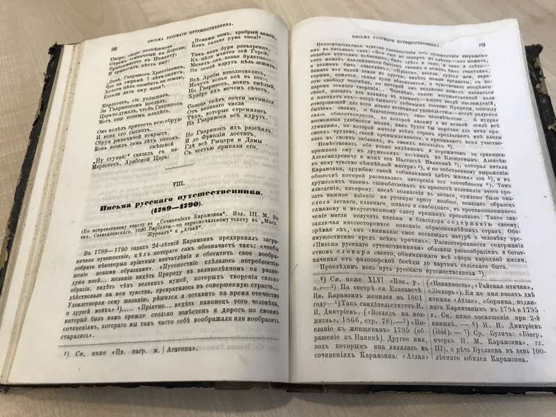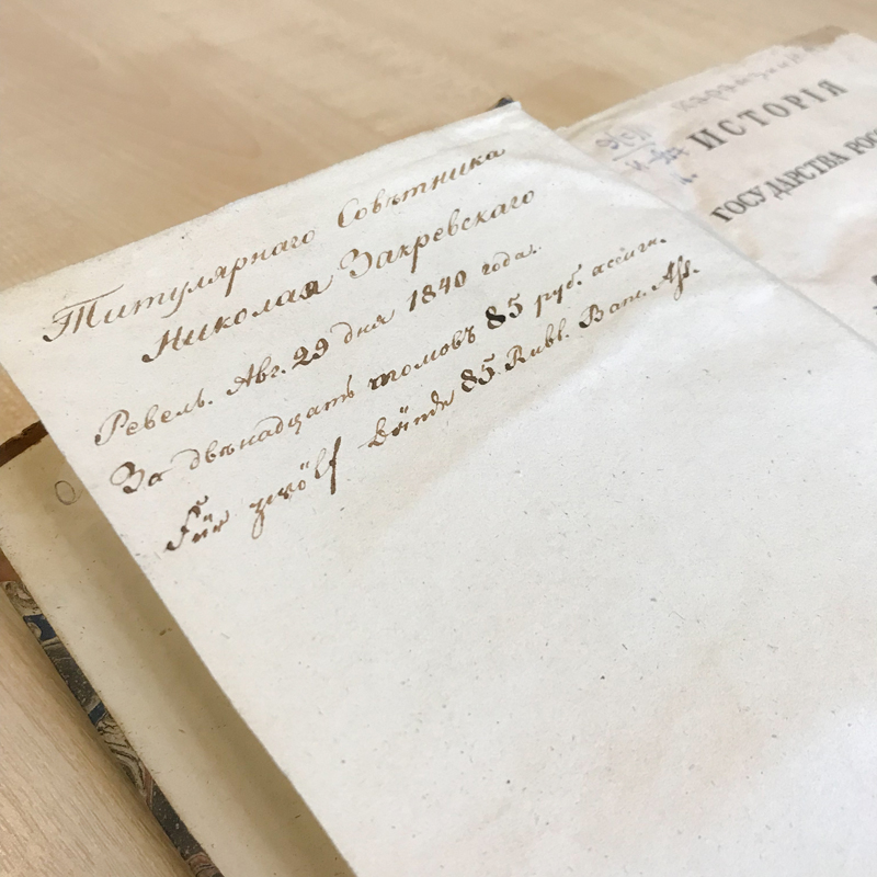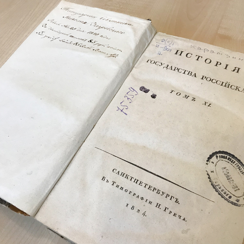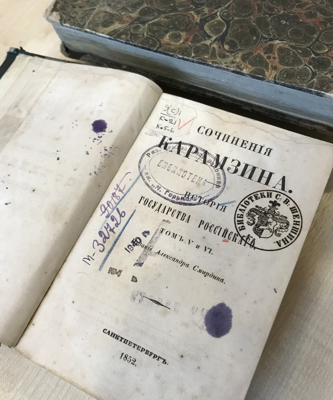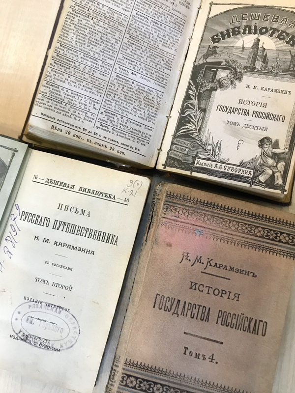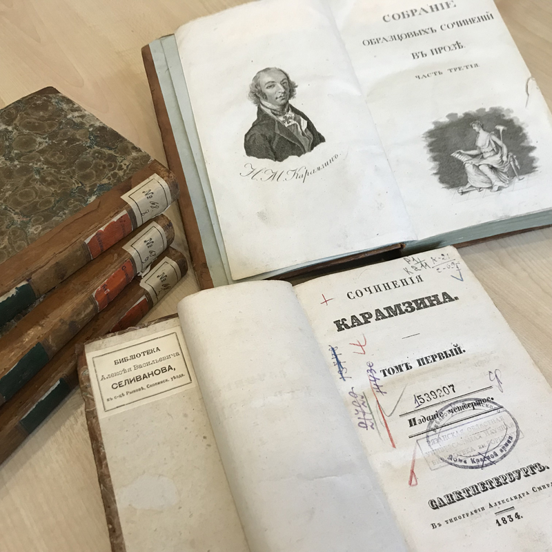 Многие книги, представленные на выставке, входили в собрания, принадлежавшие известным общественным деятелям XIX – начала XX веков: вице-адмиралу, кругосветному мореплавателю, ученому и писателю Василию Михайловичу Головнину (1776–1831), историку, этнографу, лексикографу и фольклористу Николаю Васильевичу Закревскому (1805–1871), археологу, историку, основателю и правителю дел Рязанской ученой архивной комиссии Алексею Васильевичу Селиванову (1851–1915) и другим. Многочисленные владельческие записи и экслибрисы на книгах свидетельствуют о всенародном интересе к творчеству Карамзина и отражают заслуженно высокую оценку деятельности писателя в глазах современников и потомков.