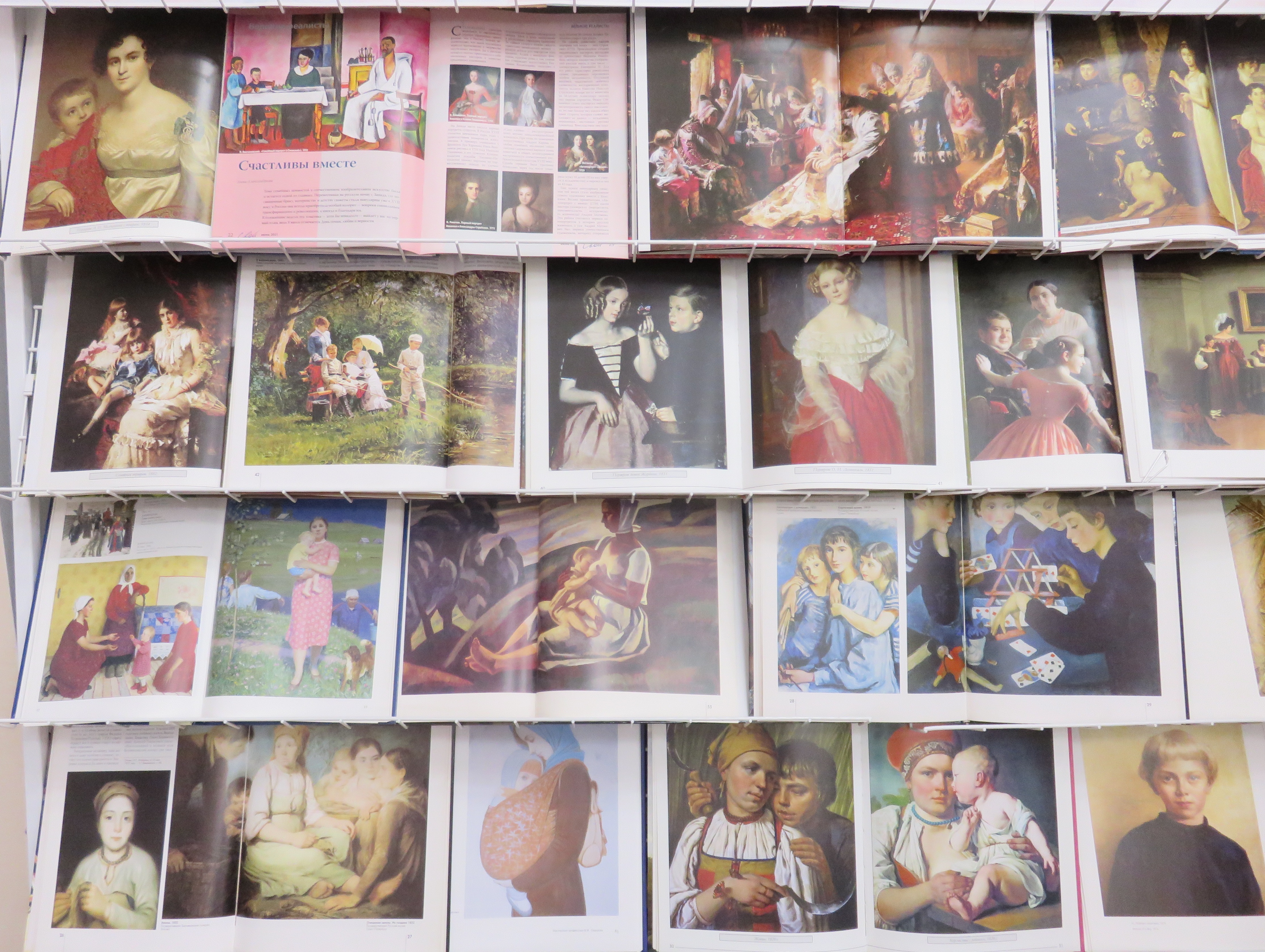На выставке представлены альбомы с репродукциями картин А. Рябушкина, А. Венецианова, К. Маковского, З. Серебряковой, В. Иванова и многих других художников.