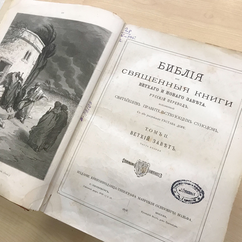 Иллюстрации для русского издания Библии напечатаны с подлинных гравюр на дереве, впервые использованных во французском издании 1866 года и выкупленных Вольфом у парижских издателей Этцеля и Мама. По сей день библейские рисунки Гюстава Доре считаются непревзойденными и продолжают воспроизводиться многомиллионными тиражами.