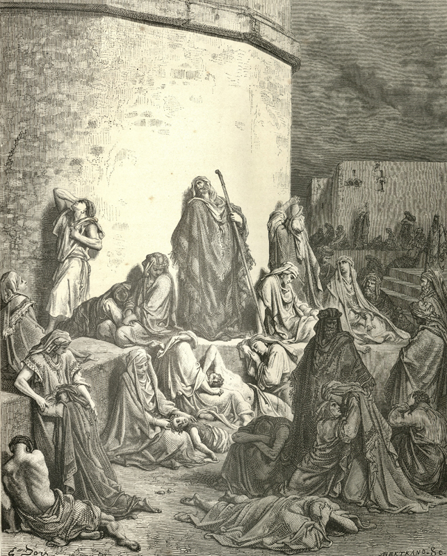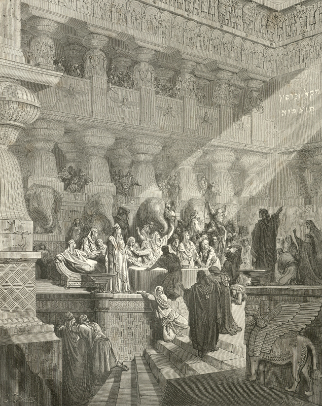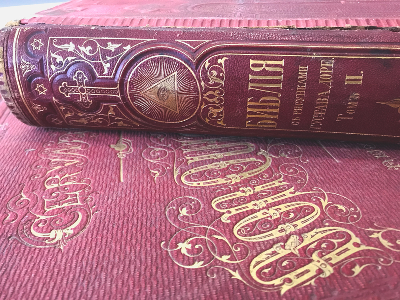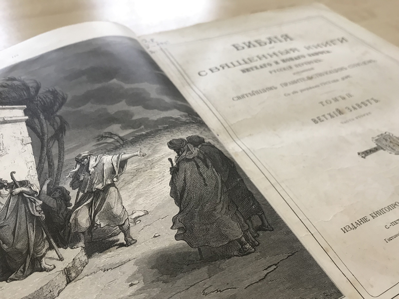 Центральное место в экспозиции занимает первое русское иллюстрированное издание Библии с рисунками Гюстава Доре, увидевшее свет в 1876–1878 годах в петербургском издательстве Маврикия Осиповича Вольфа. Работа над графической версией Ветхого и Нового заветов не была для художника простой. На иллюстрирование Священного писания он потратил два года (1864–1866). Бесконечная череда эскизов, зарисовок, набросков – все ради поиска самых точных и глубоких образов. Ветхий завет Доре проиллюстрировал 152 рисунками, на которых важная роль отведена грозным природным явлениям, на фоне которых разворачивается история, и архитектуре древних храмов, подавляющих человека своими масштабами. В Новом завете (78 рисунков) внешняя атмосфера отходит на второй план, и художник направляет свое мастерство на изображение многочисленных персонажей Библии, в том числе на образ Спасителя, сделав его центральной фигурой на многих гравюрах.