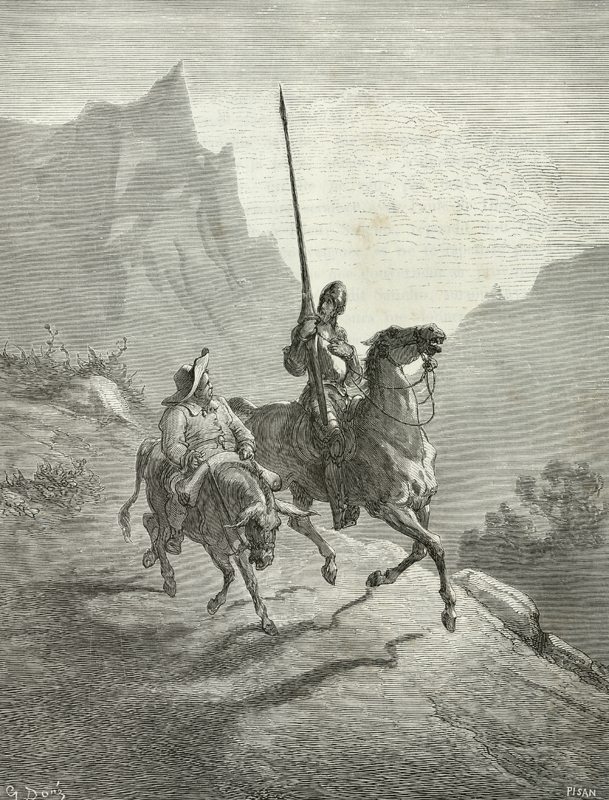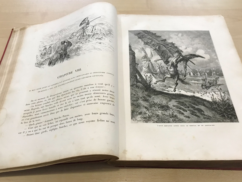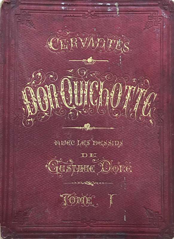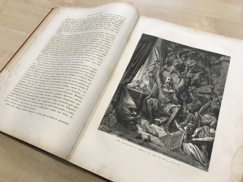 Отдельного внимания на выставке заслуживает французское издание романа Мигеля де Сервантеса «Хитроумный идальго Дон Кихот Ламанчский», опубликованное в Париже в 1869 году. Гюстав Доре создал для него 370 рисунков, по которым можно проследить путь благородного идальго со всеми его перипетиями. По словам художника Эмиля Байяра, современника Доре, «сюжет, трактовка сцены, композиция – рождались в воображении художника в совершенно законченном виде, и ему оставалось только зафиксировать это “творческое видение” на бумаге. Доре помещал где-то в углу, небрежно разбрасывая на бумаге, фигуру человека, затем несколько поодаль копье, руку, ногу, колонну храма, лошадь, колесо, группы всадников, силуэт пейзажа, потом быстро объединял все это в одну сложную по композиции сцену». Выполненные художником изображения рыцаря и его оруженосца Санчо Пансы стали всемирно известными и оказали влияние на образы этих двух персонажей в глазах многих поколений читателей.