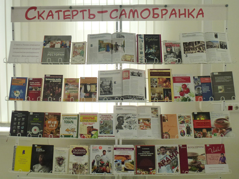 На выставке «Скатерть-самобранка» представлены книжные издания и журнальные статьи, которые освещают различные вопросы ресторанного дела: планирование, дизайн и управление на предприятиях общественного питания; состояние материально-технической базы; содержание меню с характеристиками и технологиями приготовления блюд; следование требованиям техники безопасности и другие.