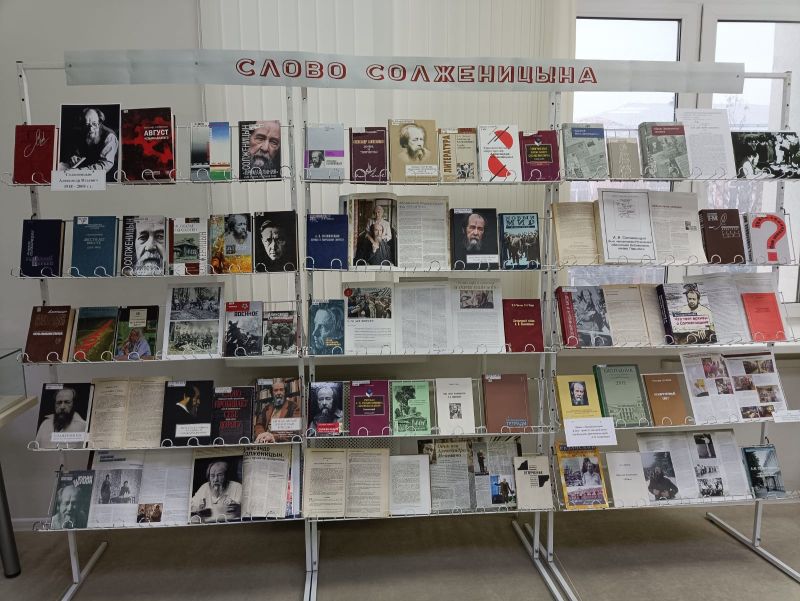 В универсальном читальном зале работает книжная выставка «Слово Солженицына». На экспозиции представлены самые известные художественные произведения писателя: «Архипелаг ГУЛАГ», «Матренин двор», «Один день Ивана Денисовича», «Раковый корпус» и другие, а также литература о его жизни и творчестве, переписка, воспоминания.