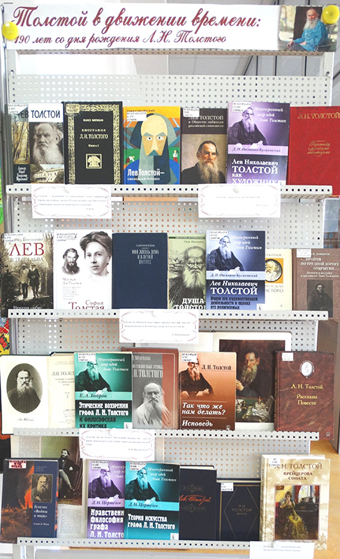 Литература, представленная на выставке, знакомит читателей с творческой биографией Льва Толстого, с его художественными и философскими произведениями, воспоминаниями современников.