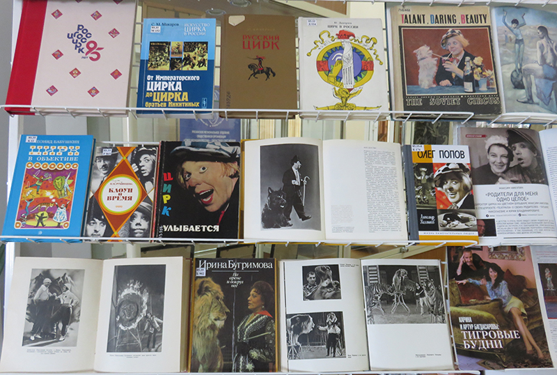 На выставке представлены книги по цирковому искусству, о знаменитых артистах цирка, клоунах и дрессировщиках.