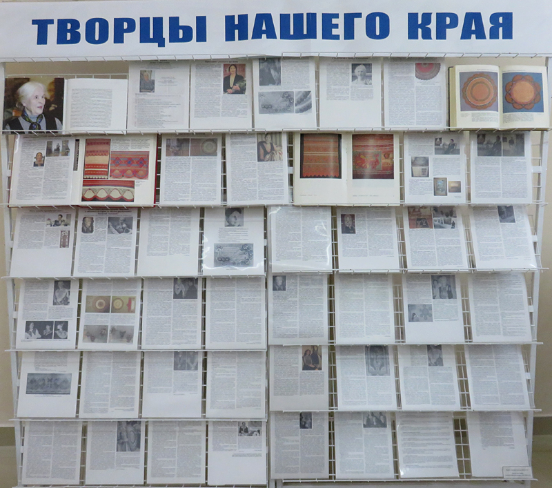 На выставке представлены книги, каталоги выставок, статьи из периодических изданий о творчестве крупнейшего мастера кружевоплетения в России.