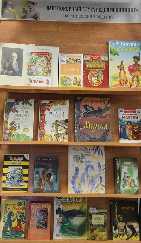 Выставка иллюстрированных книг «Ваш покорный слуга Редьярд Киплинг», организованная сотрудниками кафедры детской литературы к 160-летию со дня рождения английского писателя, лауреата Нобелевской премии по литературе, рассказывает об основных литературных произведениях Джозефа Редьярда Киплинга.