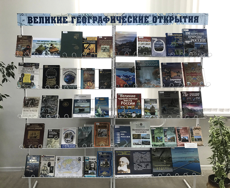 На книжной выставке в универсальном читальном зале представлены книги, рассказывающие о географических открытиях, о путешественниках, Русском географическом обществе, заповедных местах нашей страны.