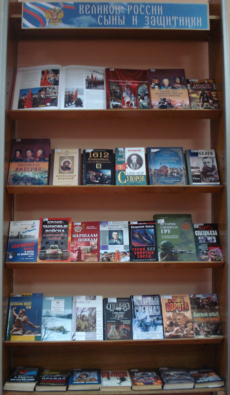 На выставке (Грибоедова,26/6) представлены издания о героических страницах нашей истории, о русских полководцах, военачальниках и подвигах простых русских солдат, а также художественные произведения на военную тематику.