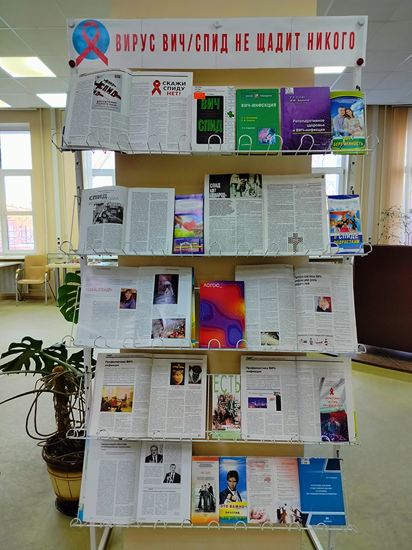 В зале периодических изданий работает выставка, приуроченная к Международному дню борьбы со СПИДом, цель которого – привлечение внимания к проблемам ВИЧ и СПИДа. Литература, представленная на выставке, знакомит посетителей с проблемами распространения вируса иммунодефицита человека, с методами профилактики, диагностики заболевания и психологической поддержки больных.